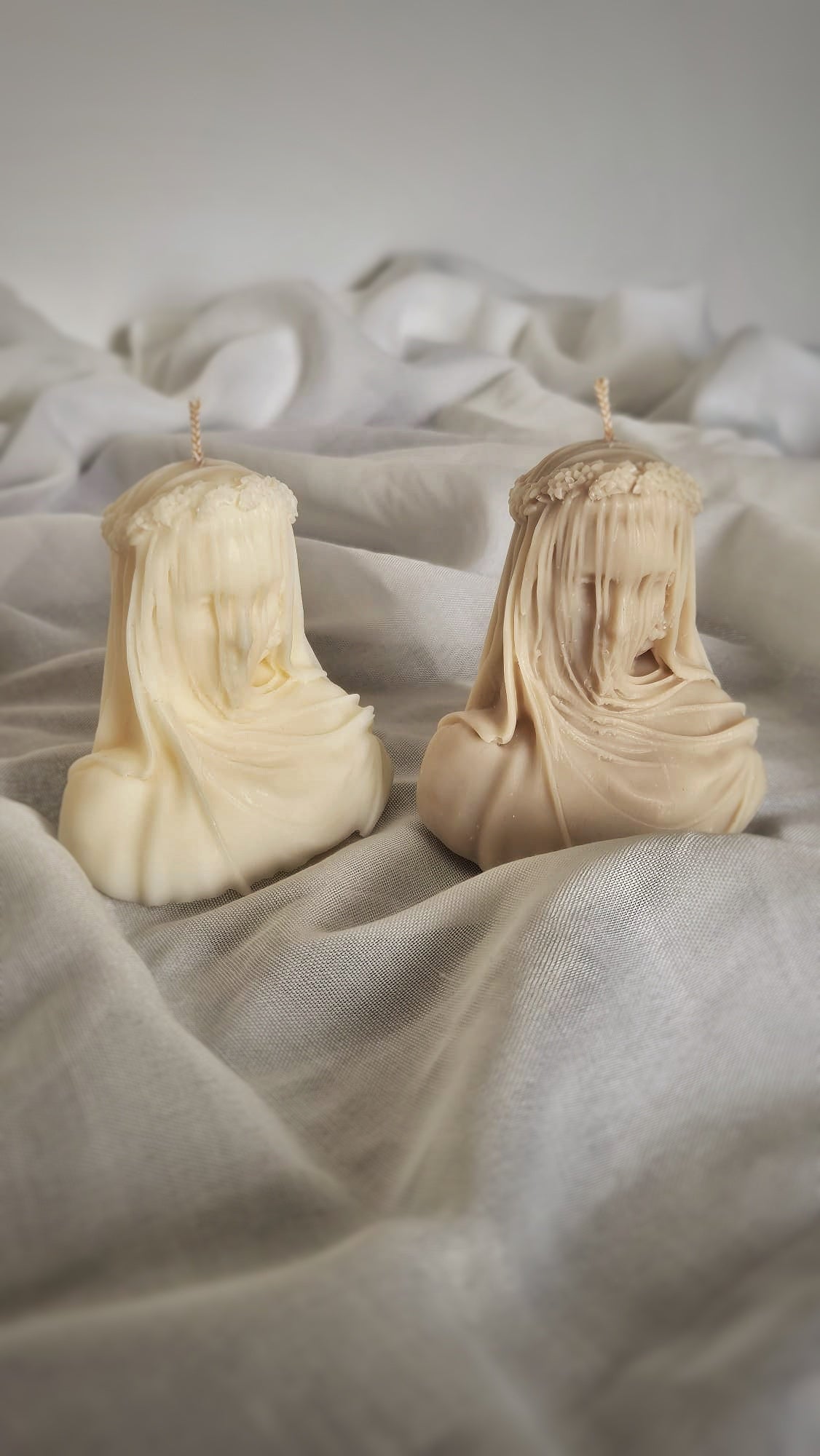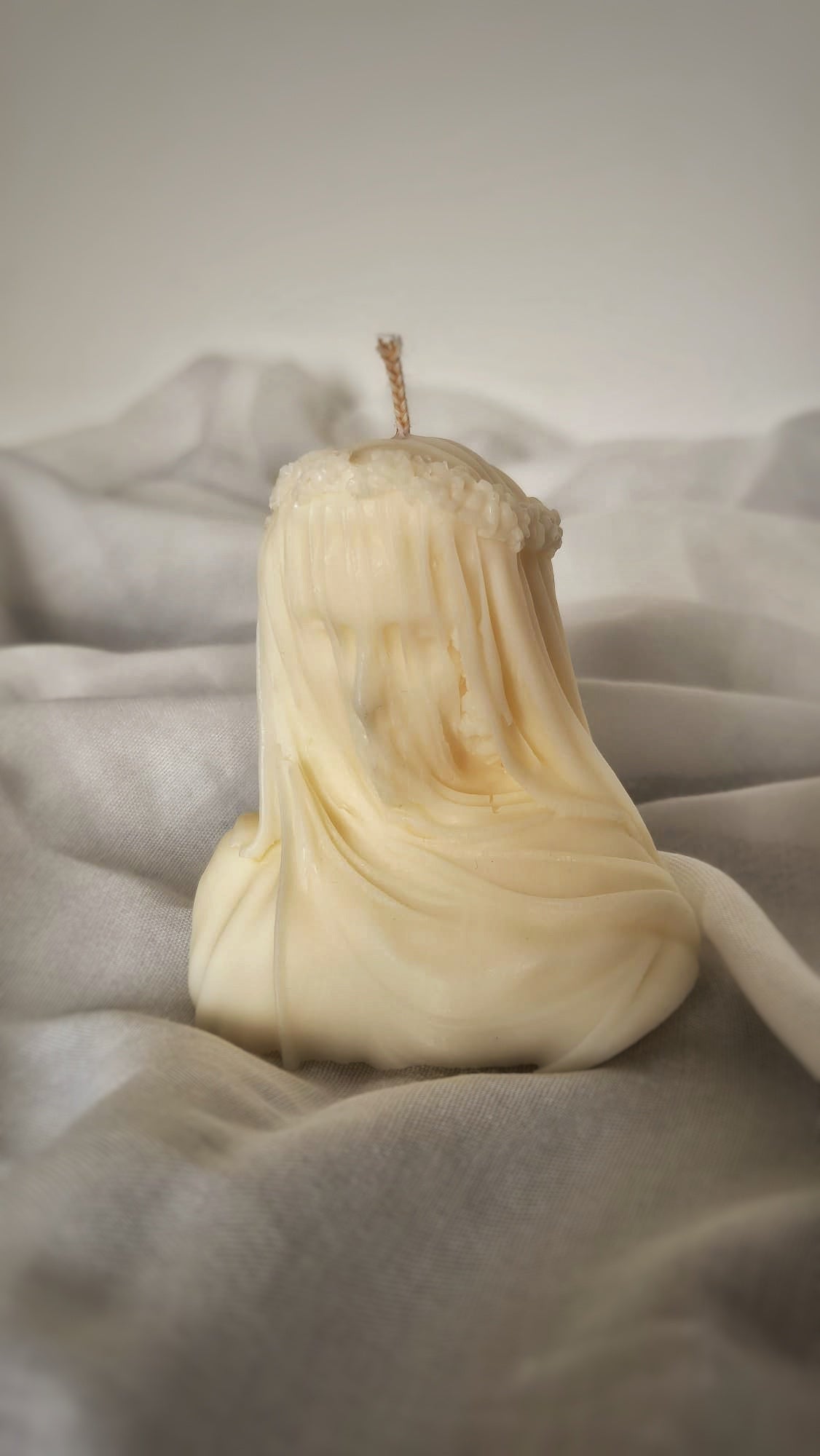 Bougie moulée en cire de soja, la figure voilée évoque la présence silencieuse et la douceur.
